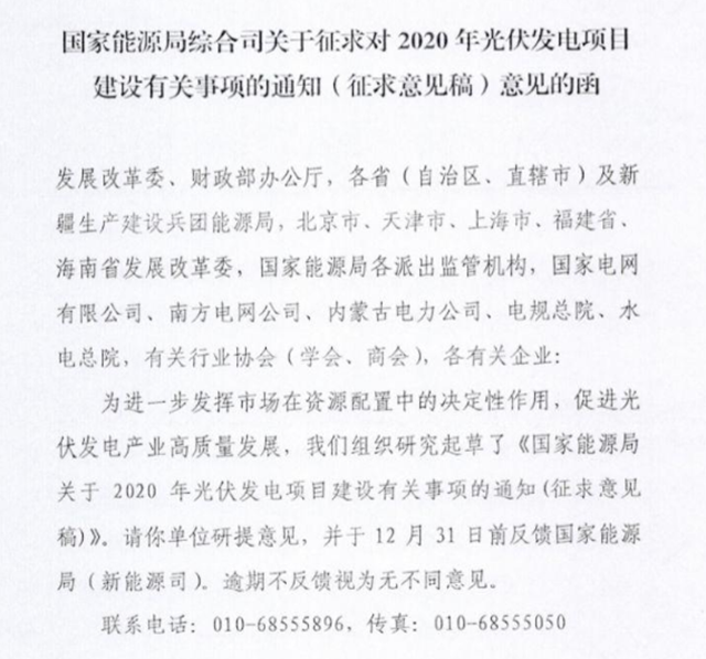 2019年12月16日,國(guó)家能源局印發(fā)《關(guān)于征求對(duì)2020年光伏發(fā)電項(xiàng)目建設(shè)有關(guān)事項(xiàng)的通知(征求意見稿)意見的函》(簡(jiǎn)稱“通知”),其中包括五大主要內(nèi)容,明確2020年競(jìng)價(jià)項(xiàng)目配置工作總體思路、項(xiàng)目管理、競(jìng)爭(zhēng)配置方法仍按2019年工作方案執(zhí)行。