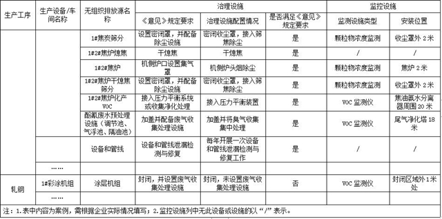 生產(chǎn)工藝過(guò)程無(wú)組織排放源清單及控制措施對(duì)照表(示例)