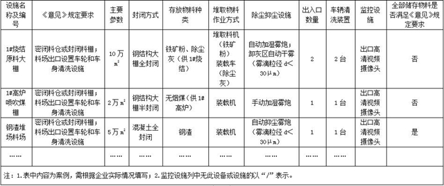 3.物料封閉儲(chǔ)存源清單。各封閉儲(chǔ)存設(shè)施分別建立清單,明確儲(chǔ)存面積、封閉方式、存放物料種類、堆取料作業(yè)方式、治理和監(jiān)控設(shè)施、主要出入口數(shù)量及配套車輛清洗裝置情況等。