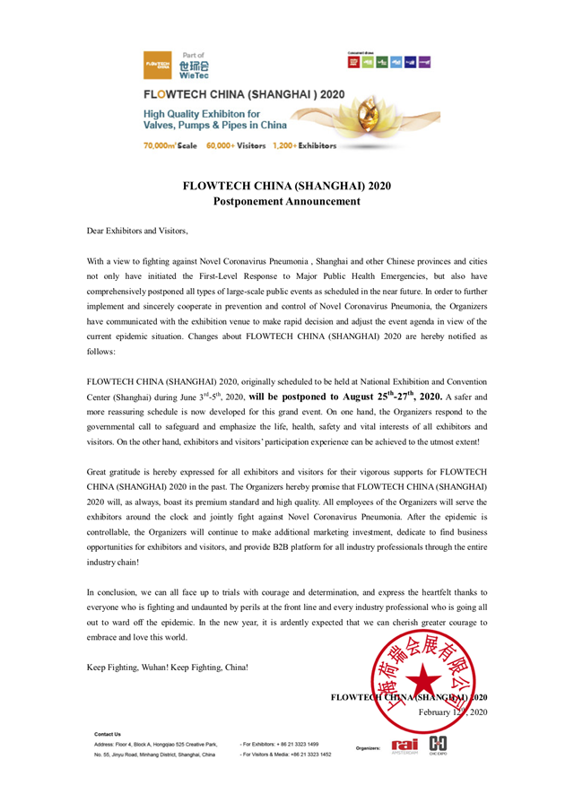鑒于目前我國(guó)新型冠狀病毒感染肺炎疫情防治面臨嚴(yán)峻形勢(shì),上海市已啟動(dòng)重大突發(fā)公共衛(wèi)生事件一級(jí)響應(yīng)機(jī)制,并全面取消或延期近期各類大型公共活動(dòng)。 為避免人員聚集引發(fā)交叉感染,降低人群集聚可能造成的疫情傳播風(fēng)險(xiǎn),保障所有展商、觀眾及參會(huì)人員的安全和健康,主辦方?jīng)Q定,將原定于2020年6月3-5日在上海國(guó)家會(huì)展中心(虹橋)舉辦的第九屆上海國(guó)際泵管閥展覽會(huì)將延期至2020年8月25-27日舉辦。