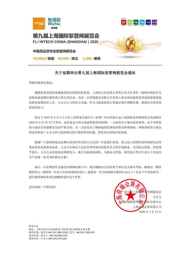 第九屆上海國(guó)際泵管閥展覽會(huì)延期舉辦通知