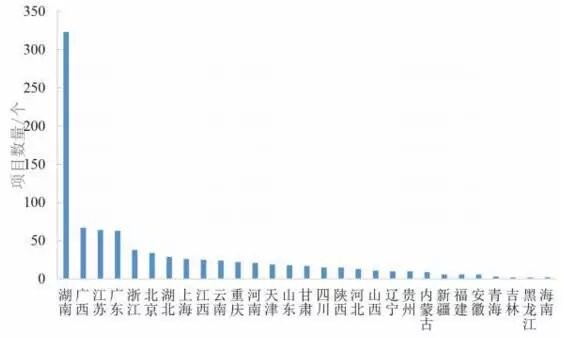 從目前所采集到的數(shù)據(jù)來看,已有29 個?。ㄗ灾螀^(qū)、直轄市)發(fā)布過土壤修復(fù)項目,如圖 4 所示。在發(fā)布項目的數(shù)量上,湖南、廣西、廣東、江蘇、浙江、北京各地較為領(lǐng)先,其中湖南省土壤修復(fù)項目數(shù)量居全國首位。