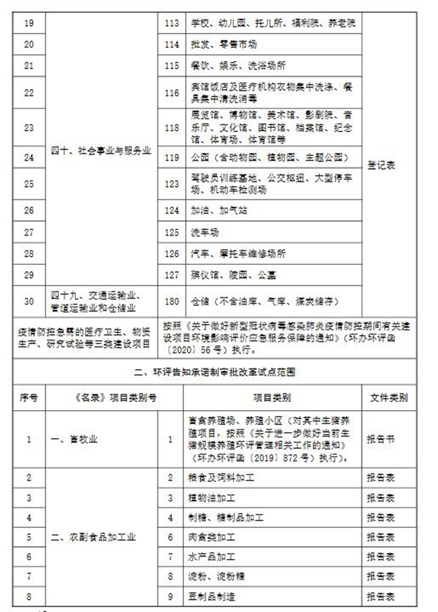 拓展環(huán)評告知承諾制審批改革試點。將環(huán)境影響總體可控、受疫情影響較大、就業(yè)密集型等民生相關(guān)的部分行業(yè)納入環(huán)評告知承諾制審批改革試點,包括工程建設(shè)、社會事業(yè)與服務(wù)業(yè)、制造業(yè)、畜牧業(yè)、交通運輸業(yè)等多個領(lǐng)域,共涉及《名錄》中17大類44小類行業(yè)。