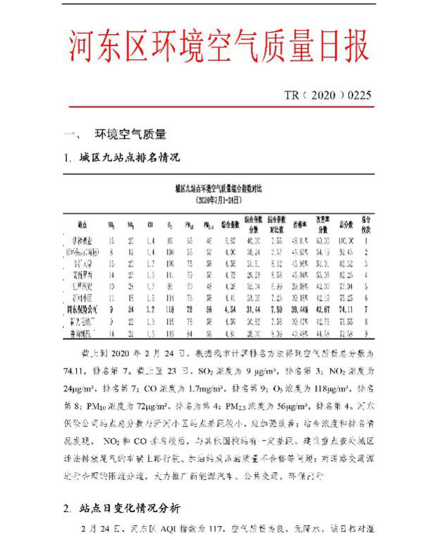 在環(huán)境管理技術(shù)指導(dǎo)過(guò)程中,公司堅(jiān)持駐場(chǎng)人員指導(dǎo)服務(wù)+總部大數(shù)據(jù)分析支撐的雙管齊下服務(wù)模式,每日為臨沂市河?xùn)|區(qū)提供環(huán)境空氣質(zhì)量日?qǐng)?bào),提供針對(duì)污染源排查的數(shù)據(jù)分析報(bào)告,如分析2020年春節(jié)前后機(jī)動(dòng)車變化情況對(duì)國(guó)控站點(diǎn)的數(shù)據(jù)影響程度的“春節(jié)效應(yīng)”、“祭祀效應(yīng)”等。
