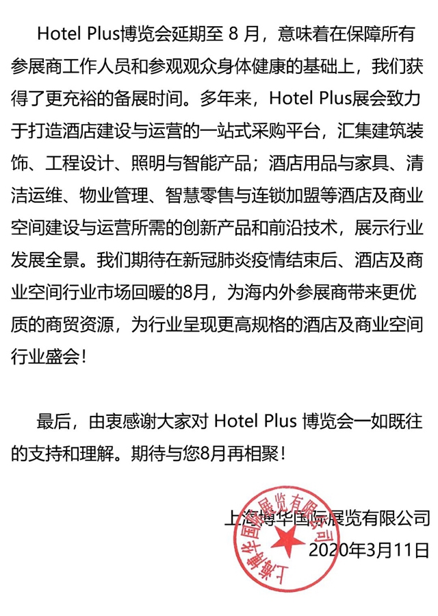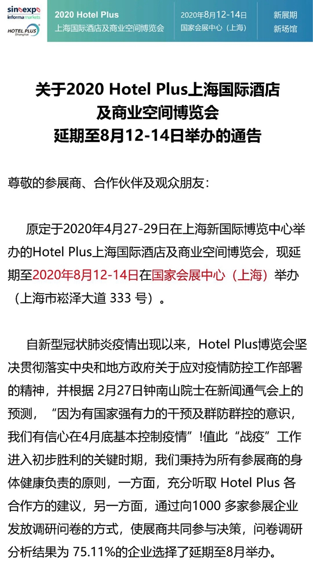 受新型冠狀病毒影響,全國各行各業(yè)的經(jīng)濟活動都受到了不同程度的影響。作為國內(nèi)知名展會,Hotel Plus時刻關(guān)注著酒店及商業(yè)空間的行業(yè)發(fā)展。秉持著為所有參展商及觀眾的身體健康負責(zé)的原則,經(jīng)主辦方慎重考慮,Hotel Plus上海國際酒店及商業(yè)空間博覽會及旗下子展決定延期至8月。