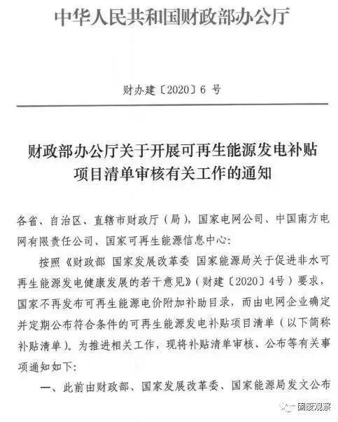 3月16日,財(cái)政部辦公廳印發(fā)《關(guān)于開展可再生能源發(fā)電補(bǔ)貼項(xiàng)目清單有關(guān)工作的通知》(財(cái)辦建〔2020〕6號(hào)),明確可再生能源項(xiàng)目進(jìn)入首批財(cái)政補(bǔ)貼目錄的條件。