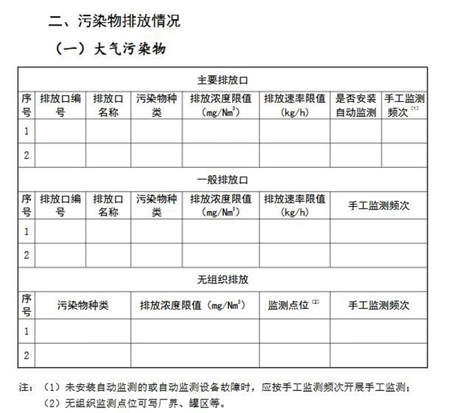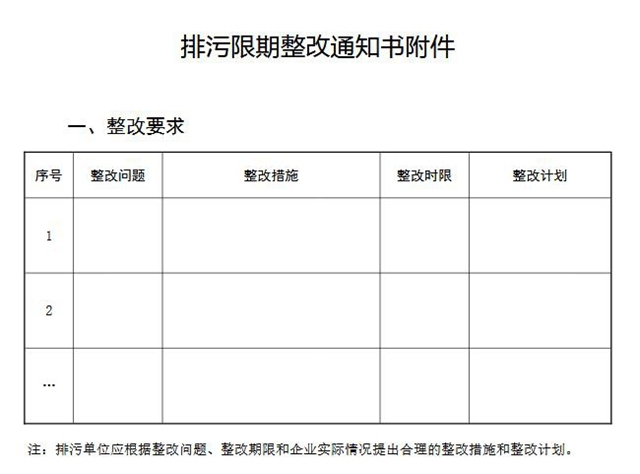 (二)附件。內容包括排污限期整改要求,列明整改問題、整改內容、整改時限等,提出整改期限內污染物排放要求,列明各排污口污染物排放法定執(zhí)行標準限值和自行監(jiān)測要求等。