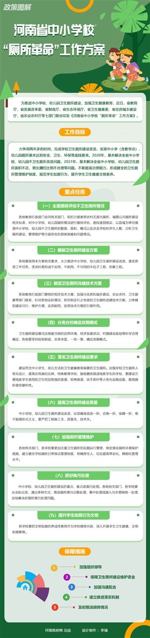 根據(jù)《教育部辦公廳等七部門(mén)關(guān)于印發(fā)<中小學(xué)校“廁所革命”行動(dòng)計(jì)劃>的通知》(教發(fā)廳〔2019〕8號(hào))精神,為切實(shí)做好我省中小學(xué)“廁所革命”工作,省教育廳七部門(mén)等結(jié)合我省實(shí)際制定了《河南省中小學(xué)校“廁所革命”工作方案》,現(xiàn)印發(fā)給你們,請(qǐng)認(rèn)真組織實(shí)施。