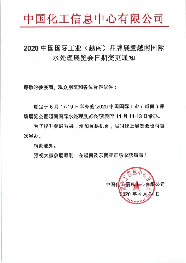 結(jié)合目前全球疫情發(fā)展趨勢(shì),也為了較大限度上確保參展商與觀眾的生命健康安全,越南國(guó)際水處理展主辦方中國(guó)化工信息中心經(jīng)與展館方溝通確認(rèn),現(xiàn)將展期變更如下: