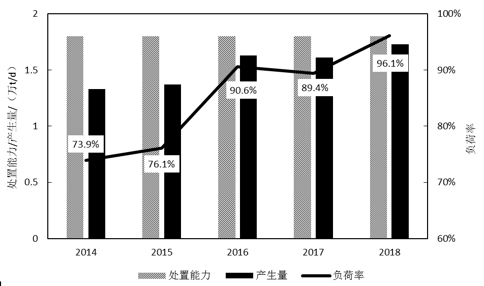 武漢市醫(yī)療廢物產(chǎn)生量逐年增長(圖2),由2014年1.33萬 t/a增長至2018年1.73萬 t/a。武漢市現(xiàn)有醫(yī)療廢物處置中心的處置能力為1.8萬 t/a,負(fù)荷率由2014年73.9%增長至2018年96.1%,接近滿負(fù)荷運(yùn)轉(zhuǎn)。2018年武漢市醫(yī)療廢物處置能力差值僅700 t/d。