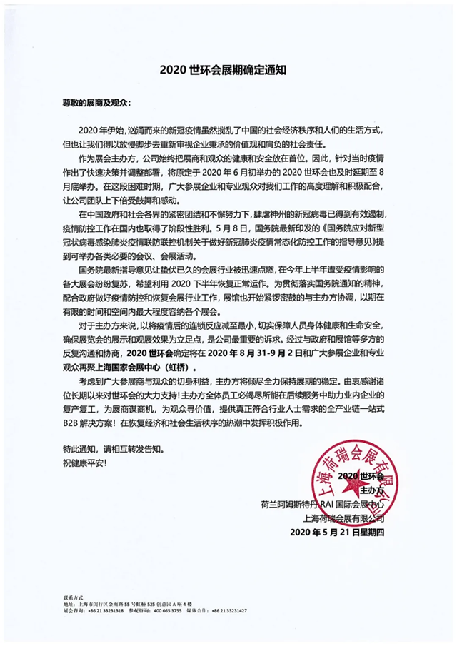 考慮到廣大參展商與觀眾的切身利益,主辦方選擇了接近的時(shí)間,傾全力保持了展期的穩(wěn)定。由衷感謝諸位長期以來對世環(huán)會的大力支持!主辦方全體員工必竭盡所能在后續(xù)服務(wù)中助力業(yè)內(nèi)企業(yè)的復(fù)產(chǎn)復(fù)工,為展商謀商機(jī),為觀眾尋價(jià)值,提供真正符合行業(yè)人士需求的全產(chǎn)業(yè)鏈一站式B2B解決方案!在恢復(fù)經(jīng)濟(jì)和社會生活秩序的熱潮中發(fā)揮積極作用。