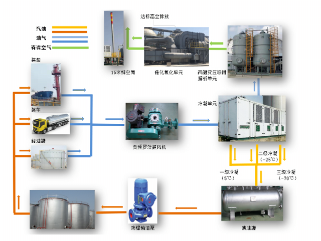 在產(chǎn)品罐區(qū)及碼頭裝船區(qū),油氣經(jīng)過“收集-輸送-冷凝(吸收)-催化氧化”等工藝處理,最終達標排放。