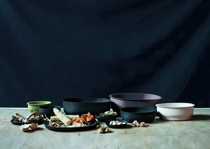 他摸索出了一套處理剩食的獨特手法:把剩菜燒成木炭,把骨頭、筋腱煮成黏膠,融合之后即可塑形,變成一套嶄新的“純天然”器皿。