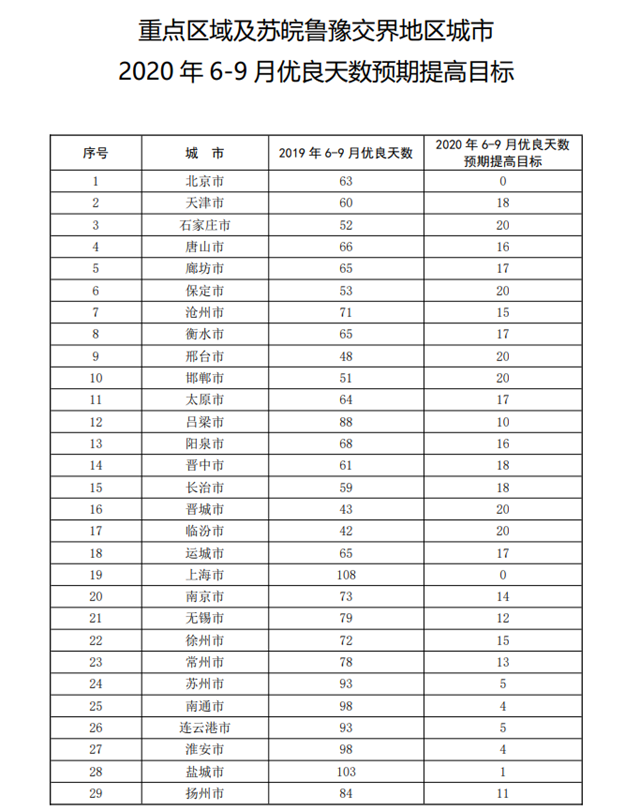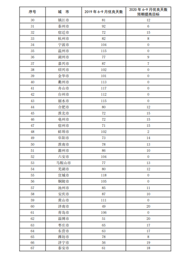 2.重點區(qū)域及蘇皖魯豫交界地區(qū)城市2020年6-9月優(yōu)良天數(shù)預(yù)期提高目標