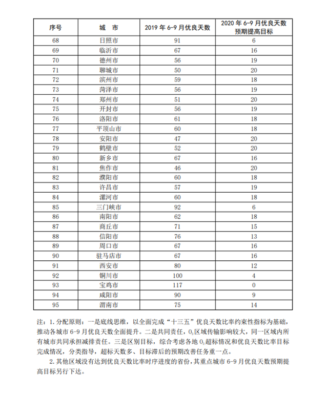 工作目標:通過攻堅行動,VOCs治理能力顯著提升,VOCs排放量明顯下降,夏季O3污染得到一定程度遏制,重點區(qū)域、蘇皖魯豫交界地區(qū)及其他O3污染防治任務(wù)重的地區(qū)城市6-9月優(yōu)良天數(shù)平均同比增加11天左右(各城市預(yù)期性目標詳見附件2),推動“十三五”規(guī)劃確定的各省(區(qū)、市)優(yōu)良天數(shù)比率約束性指標全面完成(詳見附件3)。