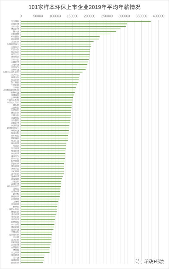 個(gè)人認(rèn)為這是兩個(gè)正面因素和一個(gè)負(fù)面因素的疊加。兩個(gè)正面因素一為,行業(yè)中出現(xiàn)了一些對(duì)高端人才更具吸引力的非環(huán)保上市企業(yè)組織,如長(zhǎng)江環(huán)保集團(tuán)、江蘇環(huán)保產(chǎn)業(yè)集團(tuán)、布局環(huán)保的大國(guó)企央企等。二為,積累了足夠資源跳出環(huán)保上市公司轉(zhuǎn)而創(chuàng)業(yè)的人群。這部分人數(shù)難以客觀(guān)統(tǒng)計(jì),但相信諸位的圈子里一定就有這兩年跳出來(lái)創(chuàng)業(yè)的朋友,總數(shù)應(yīng)該也不少。負(fù)面因素為,數(shù)量不少環(huán)保上市企業(yè)內(nèi)部實(shí)實(shí)在在的變化真的讓一些人或主動(dòng)或被動(dòng)選擇離開(kāi),甚至轉(zhuǎn)行,這也是無(wú)法回避的事實(shí)。終于要討論到收入了,直奔主題:環(huán)保上市公司的薪酬情況如何?本文整理了101家樣本環(huán)保上市公司(在前文人員工統(tǒng)計(jì)分析102家樣本基礎(chǔ)上再次剔除異常值“科林環(huán)保”)的薪資支付現(xiàn)金流數(shù)據(jù),即年報(bào)現(xiàn)金流量表“支付給職工以及為職工支付的現(xiàn)金”科目。(注:支付給職工以及為職工支付的現(xiàn)金主要包括——本期實(shí)際支付給職工的工資、獎(jiǎng)金、各種津貼和補(bǔ)貼等;以及為職工支付的養(yǎng)老、失業(yè)等社會(huì)保險(xiǎn)基金、補(bǔ)充養(yǎng)老保險(xiǎn)、企業(yè)為職工支付的商業(yè)保險(xiǎn)金、住房公積金、支付給職工的住房困難補(bǔ)助,以及企業(yè)支付給職工或?yàn)槁毠ぶЦ兜母@M(fèi)用等)將結(jié)果與員工人數(shù)相除,得到企業(yè)薪酬圖表。