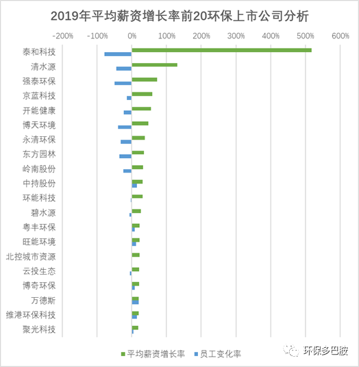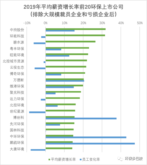 多就是多,少就是少,在此沒(méi)有必要對(duì)個(gè)別企業(yè)作單獨(dú)展開(kāi)。咱說(shuō)說(shuō)整體情況,2019年,百余家環(huán)保上市公司為超過(guò)40萬(wàn)員工支付的薪酬為464.8億元,平均年薪為11.41萬(wàn)元,較2018年增長(zhǎng)了1.84萬(wàn)元。聽(tīng)起來(lái)還不錯(cuò),但注意這是企業(yè)端的薪金成本,并非員工到手的收入,不精細(xì)地推算,對(duì)應(yīng)員工平均月薪為稅前8300元。智聯(lián)招聘針對(duì)2019年冬季求職行業(yè)平均薪酬的調(diào)查數(shù)據(jù)顯示環(huán)保行業(yè)平均薪酬為8070元。將本文研究對(duì)象為水準(zhǔn)偏高的環(huán)保上市公司這一因素考慮在內(nèi),兩個(gè)結(jié)果實(shí)際是高度吻合的。做環(huán)保的企業(yè),哪家還沒(méi)個(gè)Big Dream?當(dāng)下的收入重要,未來(lái)的錢(qián)景,也即收入的增長(zhǎng)勢(shì)頭也同樣重要。為此,我將2019年平均薪資增長(zhǎng)率前20位的環(huán)保上市公司摘出,得到如下結(jié)果: