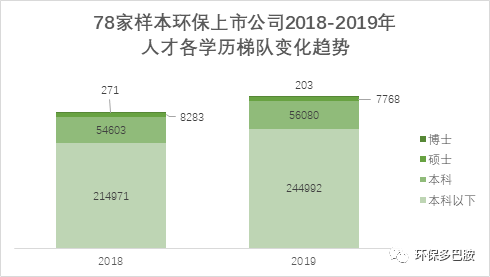 答案似乎是否定的。根據(jù)上市公司年報(bào),2019年102家環(huán)保企業(yè)(統(tǒng)計(jì)口徑已在數(shù)據(jù)圖表中說(shuō)明)員工總數(shù)為40.7萬(wàn)人,較2018年增長(zhǎng)10.5%。換言之,至少在上市公司這一環(huán)保產(chǎn)業(yè)中流砥柱群體,2019年的環(huán)保從業(yè)者總數(shù)并未因產(chǎn)業(yè)的波動(dòng)而出現(xiàn)下降。但這個(gè)數(shù)據(jù)背后并非沒(méi)有隱憂(yōu)。首先,雖然行業(yè)整體從業(yè)員工總數(shù)增長(zhǎng),但2019年員工數(shù)減少的企業(yè)依然占了3成——33家。其次,3.9萬(wàn)人的凈增長(zhǎng)人數(shù),超過(guò)一半來(lái)自于僑銀環(huán)保這一家環(huán)衛(wèi)企業(yè)(注:由于是新IPO企業(yè),2018年員工數(shù)據(jù)使用的是招股說(shuō)明書(shū)中2018年6月30日的數(shù)據(jù))。除開(kāi)僑銀環(huán)保,101家環(huán)保上市公司2019年員工數(shù)增長(zhǎng)不超過(guò)5%。和數(shù)量同樣重要的是質(zhì)量。A股上市公司年報(bào)中一般有針對(duì)員工群體學(xué)歷層次的詳細(xì)數(shù)據(jù)——這也是我們進(jìn)一步分析環(huán)保企業(yè)人才結(jié)構(gòu)和變化趨勢(shì)的最好材料。這部分我們統(tǒng)計(jì)了有相關(guān)數(shù)據(jù)披露的78家環(huán)保上市公司數(shù)據(jù)(排除中國(guó)天楹的全部A股上市環(huán)保公司,包括盛運(yùn)環(huán)保和有相關(guān)數(shù)據(jù)披露的港股綠色動(dòng)力環(huán)保),得到的結(jié)果如下。顯而易見(jiàn),上述環(huán)保從業(yè)者總數(shù)增長(zhǎng)的結(jié)果主要來(lái)自本科以下的從業(yè)群體。所謂“高素質(zhì)人才”隊(duì)伍中,僅有本科員工有2.7%的增長(zhǎng)。而碩博數(shù)都有所下降,特別是博士群體,人數(shù)直接減少了四分之一。