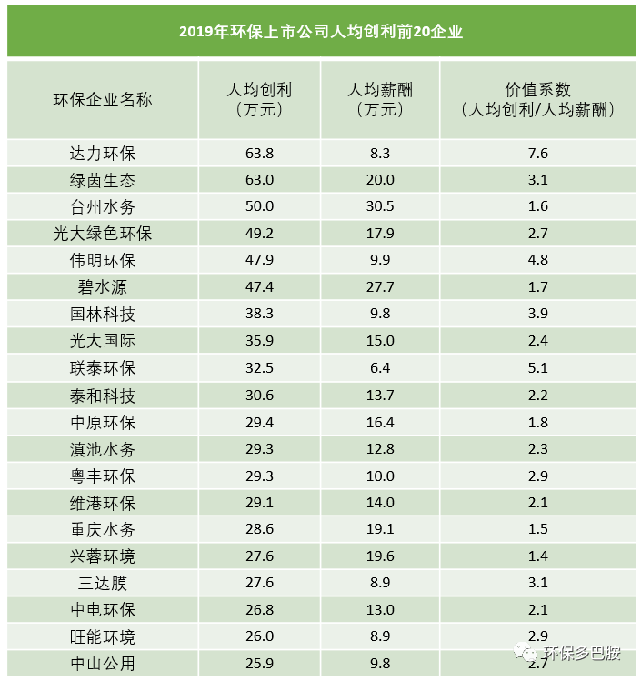 本來(lái)這部分研究是期望將平均薪資增長(zhǎng)率排在前列的企業(yè)篩選出來(lái),作為對(duì)求職者的選擇參考。結(jié)果發(fā)現(xiàn)前9位企業(yè)的平均薪資增長(zhǎng)竟然無(wú)一例外伴隨著員工數(shù)顯著減少,并且其中兩家企業(yè)2019年的凈利潤(rùn)為負(fù)。我們當(dāng)然理解為應(yīng)對(duì)行業(yè)波動(dòng)企業(yè)需做出一定的人員優(yōu)化,但平均薪資的增長(zhǎng)的動(dòng)能若主要來(lái)自于人員優(yōu)化,并且人員優(yōu)化并未帶來(lái)企業(yè)的扭虧為盈,或許這家公司就并非一個(gè)就業(yè)的理想選擇。為此,再設(shè)立“年員工變化率>-20%;2019年凈利為正”兩項(xiàng)標(biāo)準(zhǔn),重新篩選滿(mǎn)足條件的薪資增長(zhǎng)率前20環(huán)保上市公司,這次得到的結(jié)果似乎更值得求職者參考。當(dāng)然,開(kāi)工資也并非是個(gè)比誰(shuí)慷慨給得多的游戲。在任何組織,個(gè)人的收入都是應(yīng)該與貢獻(xiàn)的價(jià)值所掛鉤的。這是現(xiàn)代雇傭制的邏輯基礎(chǔ)。將企業(yè)凈利與員工數(shù)相除,可得出企業(yè)的人均創(chuàng)利——這可以衡量企業(yè)每個(gè)“人”創(chuàng)造的貨幣價(jià)值。而人均創(chuàng)利與人均薪酬的比值,則衡量了企業(yè)經(jīng)營(yíng)管理視角下雇傭員工的“收益率”。如果在一百年前,這類(lèi)數(shù)值或許可以用來(lái)控訴資本家的剝削。但在當(dāng)下,這或許被理解為企業(yè) “平臺(tái)價(jià)值”和“精細(xì)化管理水平”的衡量尺度更為合適。從此分析視角,將人均創(chuàng)利前20的環(huán)保企業(yè)數(shù)據(jù)整理如下。數(shù)字本身很清晰,每個(gè)企業(yè)數(shù)據(jù)背后的冷暖和故事各有各的理解,我個(gè)人不能也不必過(guò)度展開(kāi),仁者見(jiàn)仁智者見(jiàn)智就好。在此僅分析行業(yè)整體的兩個(gè)點(diǎn):第一,2019年行業(yè)整體的人均創(chuàng)利水平是7.6萬(wàn)元。既不如人均薪酬的11.4萬(wàn)元,也較2018年人均創(chuàng)利數(shù)據(jù)的7.8萬(wàn)元有所減少。第二,將上百家環(huán)保企業(yè)的人均創(chuàng)利數(shù)據(jù)分別和人均薪酬以及研究生以上員工比例做回歸分析,得到的線(xiàn)性回歸決定系數(shù)R2分別是0.0297和0.0049——這說(shuō)明整體而言,環(huán)保企業(yè)的人均創(chuàng)利和公司開(kāi)多少錢(qián)只能說(shuō)弱相關(guān),和公司的高素質(zhì)人才比例則是更弱地相關(guān)。換言之,至少在本研究視角,環(huán)保企業(yè)整體的激勵(lì)措施的有效性很弱,而高素質(zhì)人才隊(duì)伍的打造對(duì)人均產(chǎn)出率的加成則更加沒(méi)有效果。這是個(gè)多少讓人感到遺憾和沮喪的結(jié)論。整體情況并不樂(lè)觀(guān),本來(lái)想說(shuō)期望這種情況能盡快得到逆轉(zhuǎn),但考慮到2020年的噩夢(mèng)難度開(kāi)局,或許環(huán)保企業(yè)和個(gè)人還得再扛一扛。
