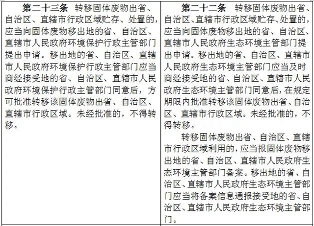 即除原來的固體廢物轉(zhuǎn)移出省貯存、處置需經(jīng)轉(zhuǎn)移審批外,固體廢物轉(zhuǎn)移出省利用的也要報移出地省級生態(tài)環(huán)境部門備案,移出地省級生態(tài)環(huán)境部門還要將備案信息通報移入地省生態(tài)環(huán)境部門。