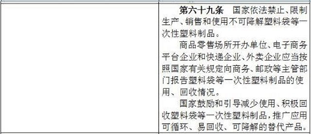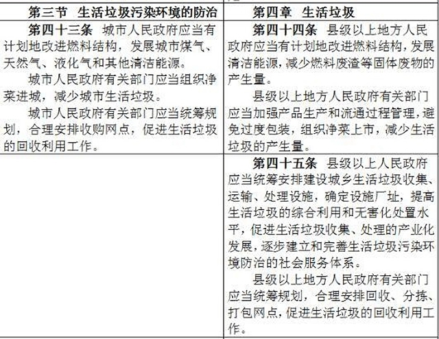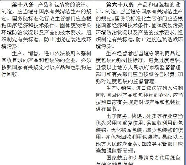 特別是新增了生活垃圾分類方面的條款,明確了生產(chǎn)企業(yè)要避免商品過度包裝、快遞業(yè)要優(yōu)先采用可重復(fù)包裝物、限制生產(chǎn)銷售使用一次性塑料制品等要求。特別明確了禁止向生活垃圾收集設(shè)施投放工業(yè)固體廢物。