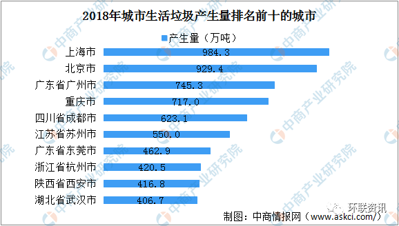 數(shù)據(jù)來源:生態(tài)環(huán)境部、中商產(chǎn)業(yè)研究院整理前十城市生活垃圾產(chǎn)生量共計6256.0萬噸,占全部信息發(fā)布城市產(chǎn)生總量的29.6%。經(jīng)濟發(fā)達的城市生活垃圾產(chǎn)量大,上海、北京生活垃圾產(chǎn)生量超900萬噸,分別為984.3萬噸、929.4萬噸。此外,廣州市、重慶市、成都市、蘇州市生活垃圾產(chǎn)生量超500萬噸。