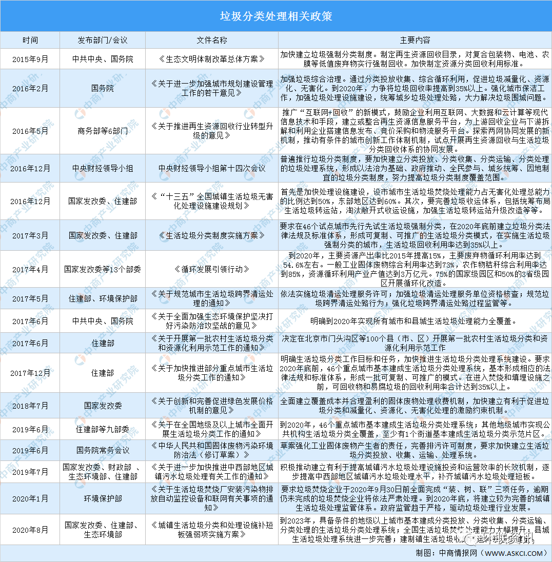 生活垃圾產(chǎn)量大,給城市環(huán)境帶來巨大的壓力,生活垃圾分類處理刻不容緩。2016年習(xí)近平總書記在中央財經(jīng)工作領(lǐng)導(dǎo)小組第十四次會議上指出,要普遍推行垃圾分類制度。此后,國家出臺了一系列政策,推動垃圾處理產(chǎn)業(yè)發(fā)展。