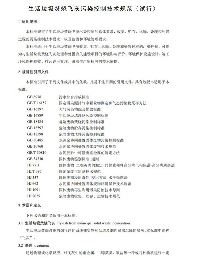 近日,生態(tài)環(huán)境部發(fā)布《生活垃圾焚燒飛灰污染控制技術(shù)規(guī)范(試行)》,其中規(guī)范和指導(dǎo)生活垃圾焚燒飛灰的環(huán)境管理,本標(biāo)準(zhǔn)規(guī)定了生活垃圾焚燒飛灰收集、貯存、運輸、處理和處置過程的污染控制技術(shù)要求。
