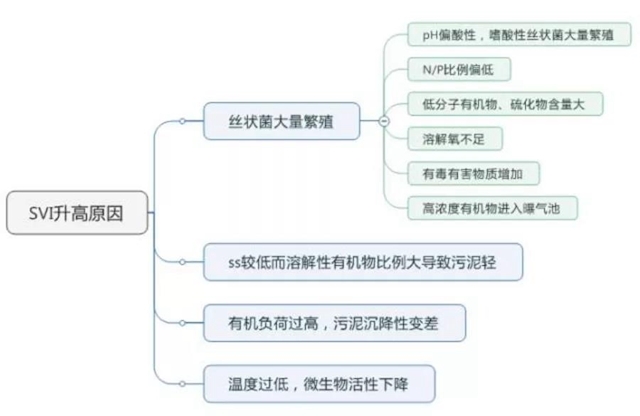 SVI值與污泥負荷有關,污泥負荷過高或過低,活性污泥的代謝性能都會變差,SVI值也會變很高,存在出現(xiàn)污泥膨脹的可能。