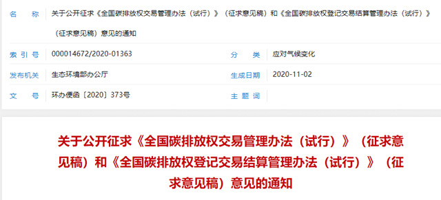為貫徹落實黨中央、國務院關(guān)于建設(shè)全國碳市場的決策部署,我部組織起草了《全國碳排放權(quán)交易管理辦法(試行)》(征求意見稿)和《全國碳排放權(quán)登記交易結(jié)算管理辦法(試行)》(征求意見稿),于11月2日起征求有關(guān)單位意見并公開征求社會意見。