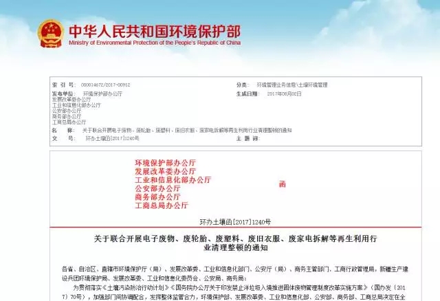 為貫徹落實(shí)《土壤污染防治行動(dòng)計(jì)劃》《國(guó)務(wù)院辦公廳關(guān)于印發(fā)禁止洋垃圾入境推進(jìn)固體廢物管理制度改革實(shí)施方案》(國(guó)辦發(fā)〔2017〕70號(hào)),環(huán)境保護(hù)部聯(lián)合發(fā)展改革委、工業(yè)和信息化部、公安部、商務(wù)部、工商總局開(kāi)展電子廢物、廢輪胎、廢塑料、廢舊衣服、廢家電拆解等再生利用行業(yè)清理整頓。