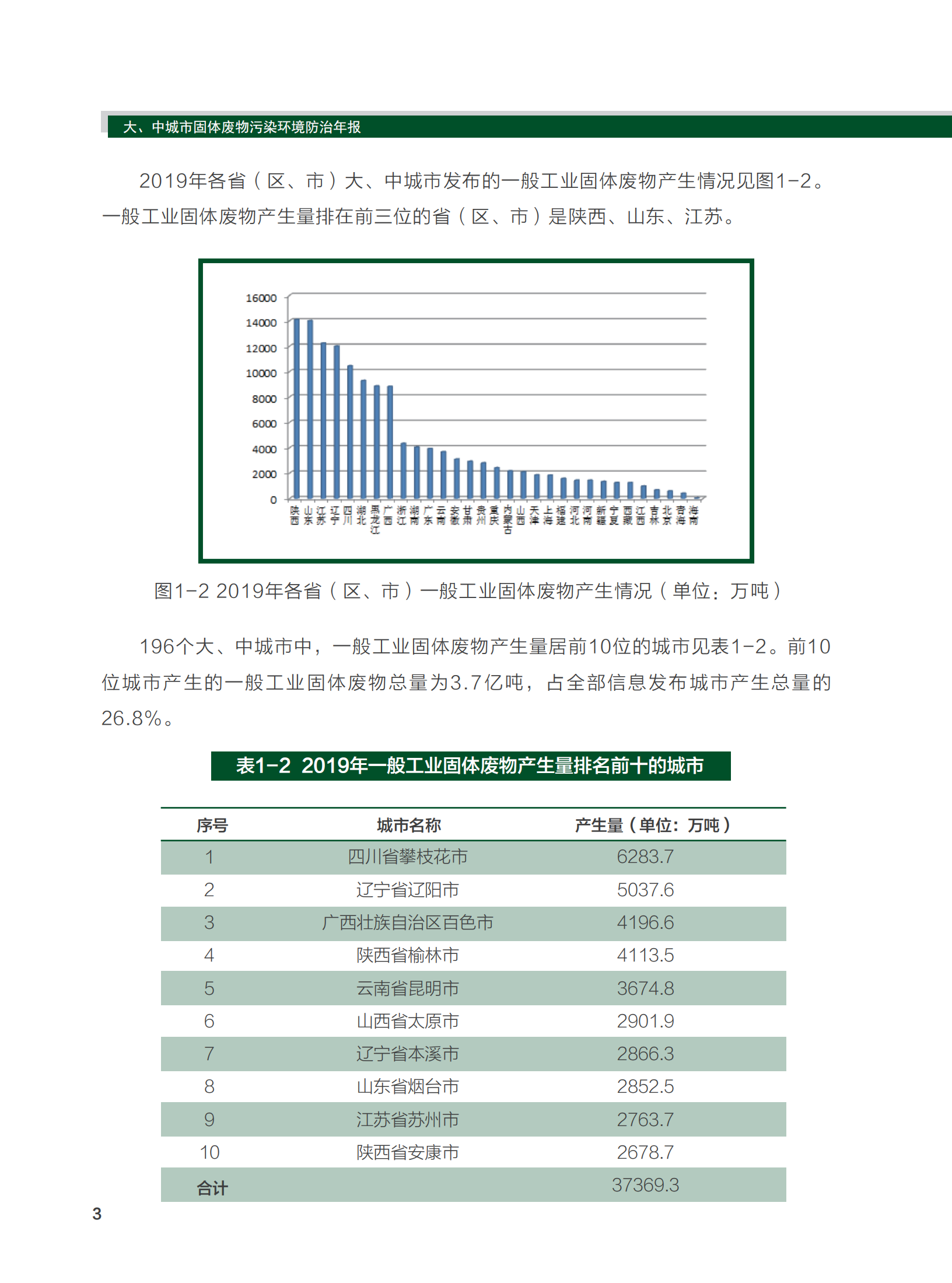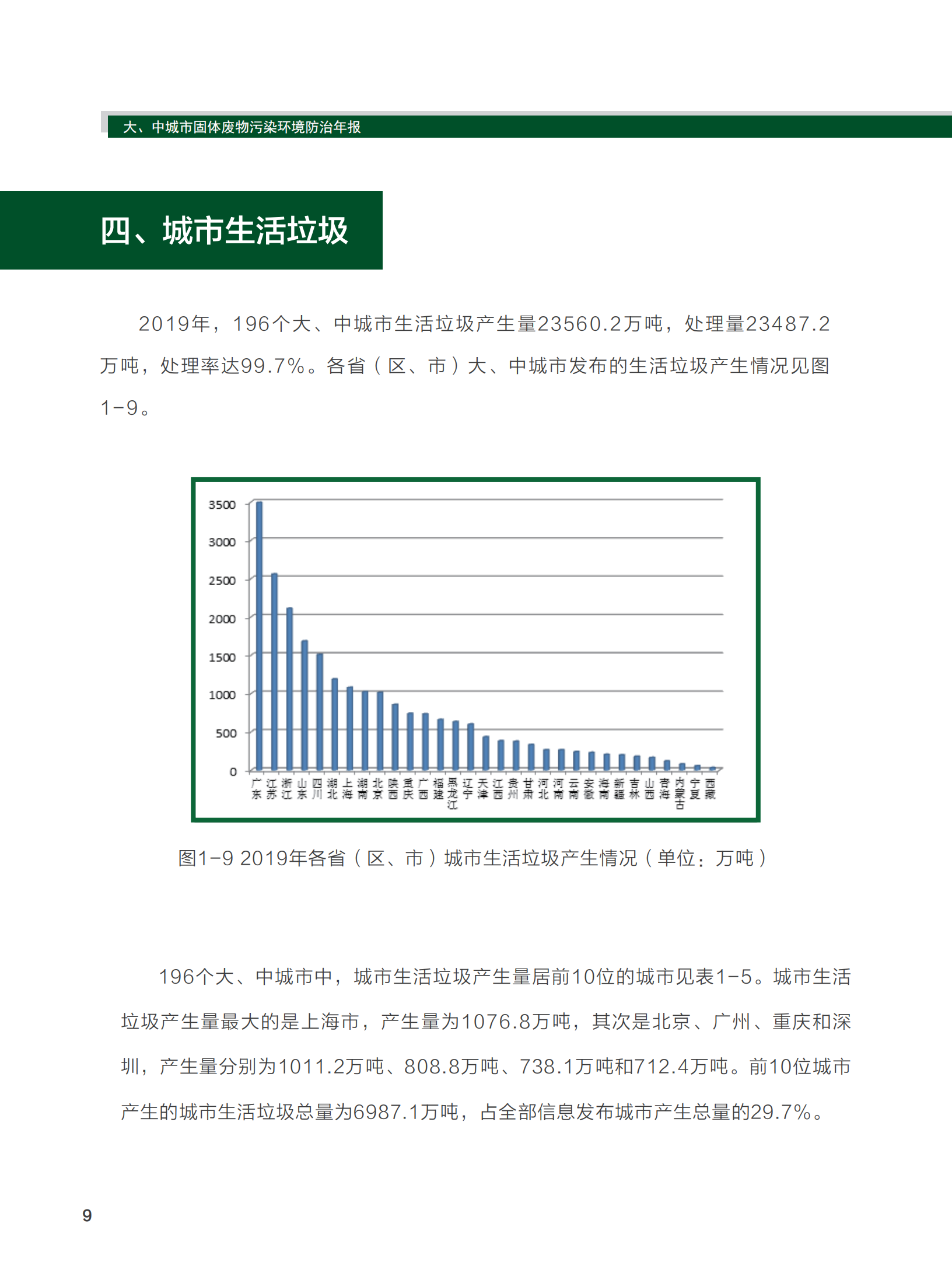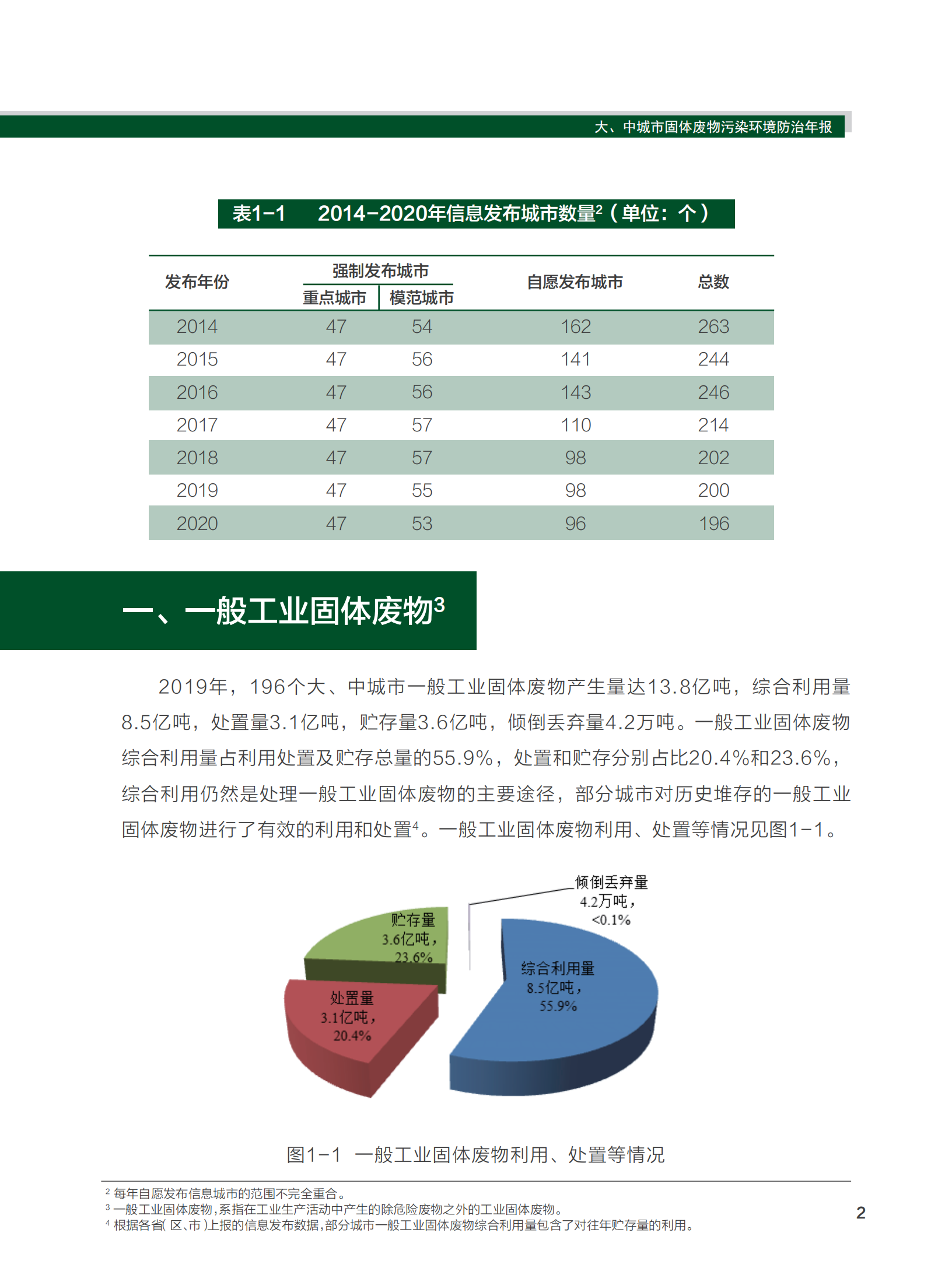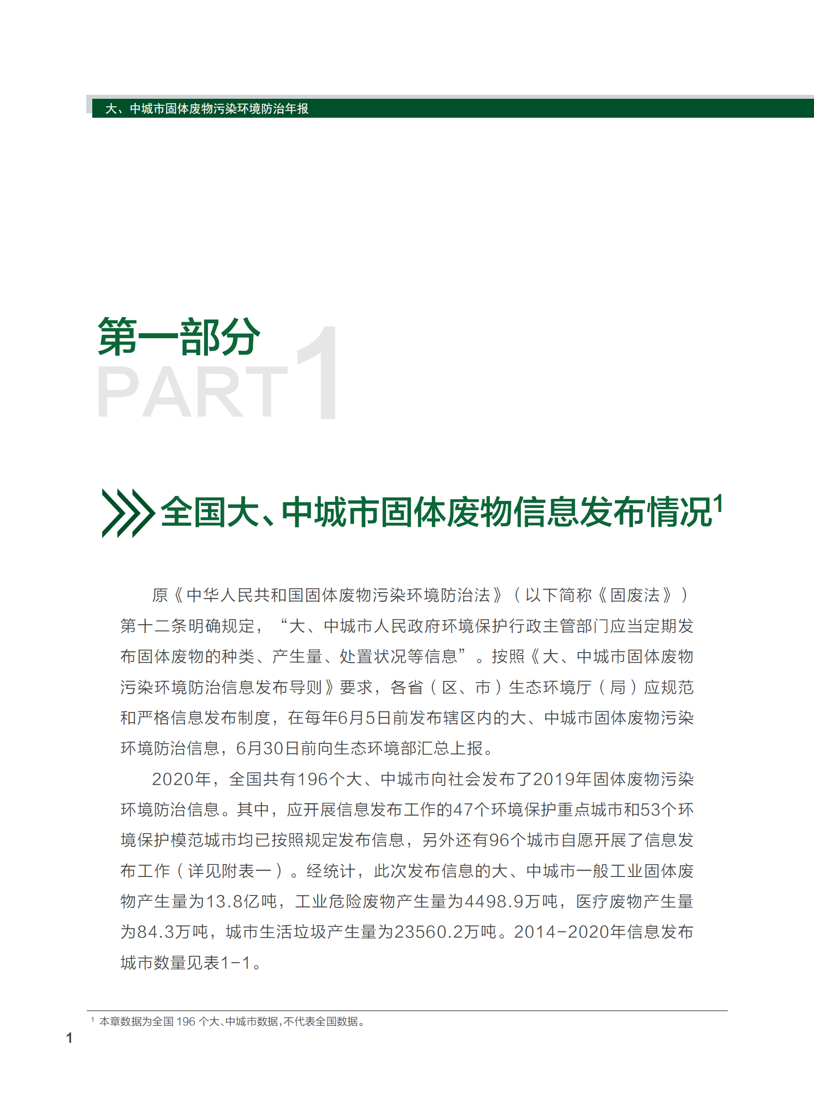 《2020年全國大、中城市固體廢物污 染環(huán)境防治年報》從大、中城市信息發(fā)布、重點工作進展以及地方工作實踐等方面, 系統(tǒng)介紹了2019年我國固體廢物污染環(huán)境防治工作的相關情況。