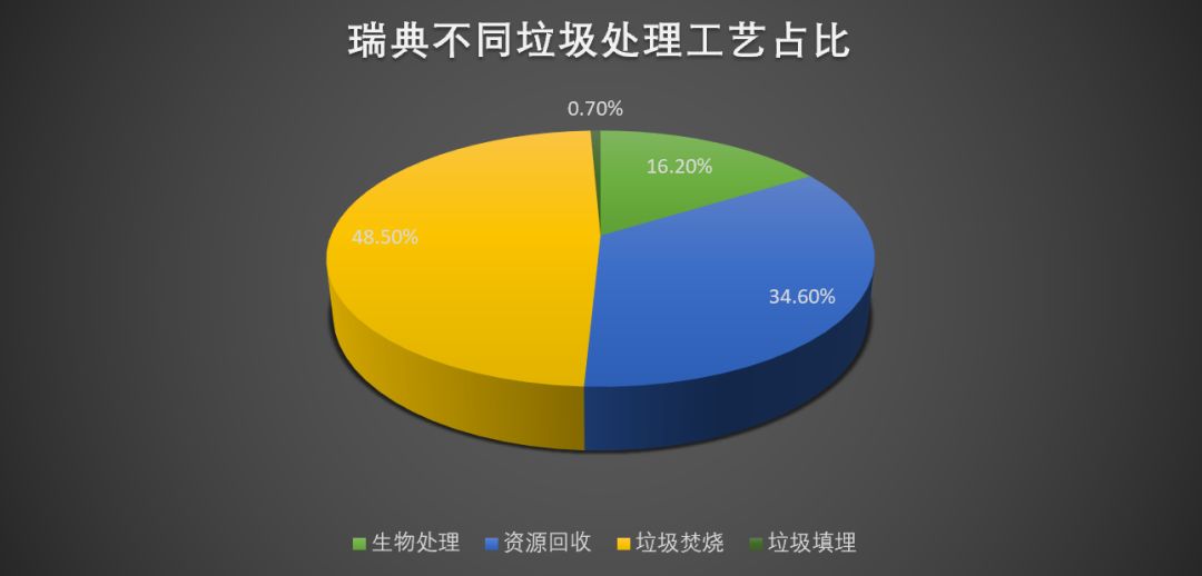 瑞典每年處理的生活垃圾大約在 466 萬噸,全國人均垃圾年產(chǎn)生量為 467 千克。在瑞典,幾乎所有的生活垃圾都被回收、加工和處理,或是作為能源使用。在瑞典的生活垃圾中,循環(huán)利用為 161.5 萬噸,占總量的 34.6% ;將有機(jī)垃圾變?yōu)槎逊省⒄託饣蚧旌戏柿系纳锾幚砹繛?75.7 萬噸,占總量的 16.2% ;將垃圾轉(zhuǎn)化為熱能和電能的焚燒處理量為 226.3 萬噸,占總量的 48.5% ;沒有利用價值被填埋處理的為 3.1 萬噸,僅占總量的 0.7%。