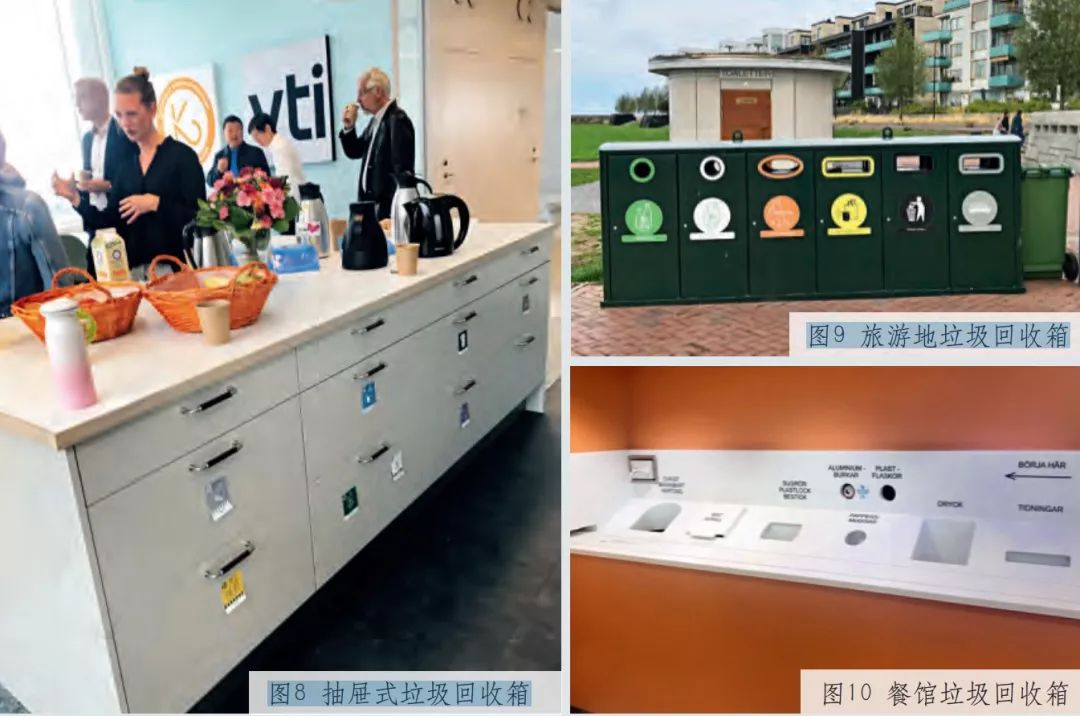 除了分類垃圾箱外,瑞典街道上還設(shè)置了具有壓縮功能的垃圾箱,并在小區(qū)通過以上展示的部分垃圾分類設(shè)施,反映出瑞典人對垃圾分類嚴(yán)謹(jǐn)認(rèn)真的精神、以人為本的理念、簡潔適用的設(shè)計原則。瑞典的垃圾分類設(shè)施不完全由政府配備,單位和機(jī)構(gòu)也可自行設(shè)置,且各具特點,已成為城市一景。