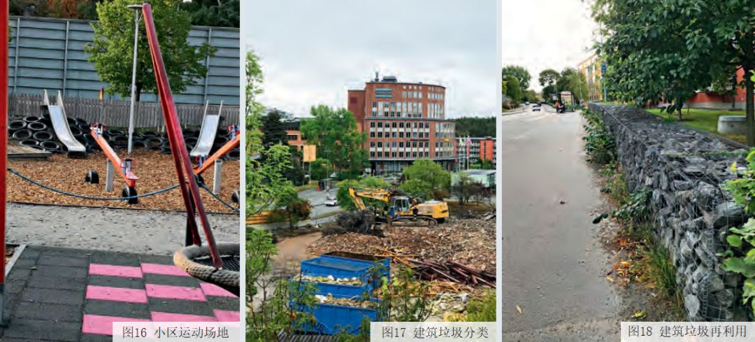 在城市的小區(qū)中還設(shè)有舊物品回收間(圖 15),市民們可以把家中不用的家具、衣物、玩具、書等舊物投放到不同的塑料桶內(nèi),由專業(yè)公司收取、處理和再利用。小區(qū)運動場地(圖 16) 利用舊輪胎等制作運動器材,做到物盡其用,減少了垃圾量。