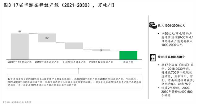 截至當(dāng)前,已有17個(gè)省市發(fā)布了垃圾焚燒中長(zhǎng)期發(fā)展規(guī)劃,根據(jù)這些省市到2030年的相關(guān)產(chǎn)能規(guī)劃,未來(lái)10年仍將有20~30萬(wàn)噸/日的新增產(chǎn)能,釋放項(xiàng)目400~500個(gè),投資規(guī)模1000~2000億元(見(jiàn)圖3)。而如果放眼全國(guó),這三個(gè)數(shù)字只會(huì)更大。這一體量不容小覷,相當(dāng)于當(dāng)前行業(yè)排名第2-9位企業(yè)的在手產(chǎn)能之和,釋放的項(xiàng)目數(shù)量則相當(dāng)于過(guò)去3年的全部開(kāi)標(biāo)項(xiàng)目數(shù)量。