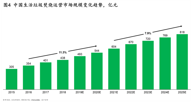 回顧“十三五”,伴隨垃圾焚燒項(xiàng)目投建的突飛猛進(jìn),運(yùn)營(yíng)市場(chǎng)同樣快速增長(zhǎng),期間年復(fù)合增長(zhǎng)率11.3%,到2020年運(yùn)營(yíng)規(guī)模達(dá)到544億元。展望“十四五”,在人均垃圾產(chǎn)生量以及垃圾焚燒比例持續(xù)上升的有利驅(qū)動(dòng)下,我們預(yù)計(jì)垃圾焚燒運(yùn)營(yíng)規(guī)模仍將保持7.9%的年復(fù)合增速,到2025年達(dá)到818億元(見(jiàn)圖4)。隨著行業(yè)監(jiān)管日趨嚴(yán)格,部分企業(yè)包括政府投資項(xiàng)目在技術(shù)、運(yùn)營(yíng)方面能力不足問(wèn)題凸顯,這為行業(yè)內(nèi)優(yōu)質(zhì)企業(yè)在運(yùn)營(yíng)管理對(duì)外服務(wù)提供了“輕資產(chǎn)化”的廣闊商機(jī)。
