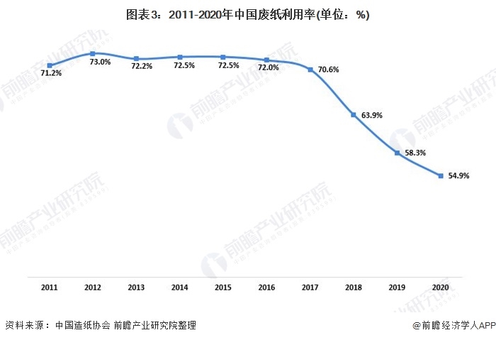 隨著我國紙類消費的逐年增加,中國對廢紙紙漿的需求也隨之擴大,導致廢紙供不應求。由于進口廢紙在價格和得漿率上的優(yōu)勢,中國較大規(guī)模的造紙企業(yè)都傾向于購買幾口廢紙,從而抑制了中國廢紙回收相關企業(yè)的發(fā)展。導致目前我國廢紙回收水平較低。
