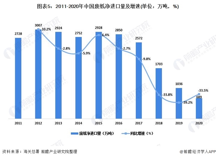 近十年來,中國對進口廢紙的依賴度一直維持在40%左右,占據較大的比重。但是,從2017年開始,由于政府對“洋垃圾”的嚴格管控、環(huán)保部對進口廢物利用違法行為的整治加上中美貿易爭端的進一步升級,導致中國廢紙進口量呈現顯著下滑的趨勢。2020年,中國廢紙凈進口量為689萬噸,同比下降50.36%。