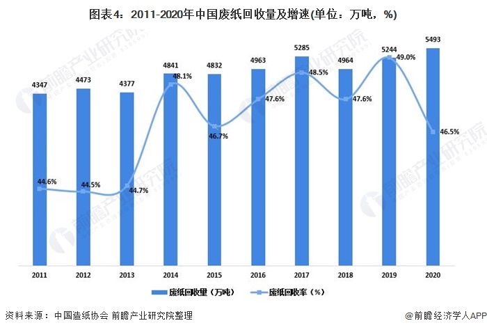 近年來,政府嚴格控制廢紙等固體廢物的進口,為中國廢紙回收企業(yè)的發(fā)展提供了機會。2020年,中國回收廢紙總量5493萬噸,同比增長4.75%,廢紙回收率達到46.5%。