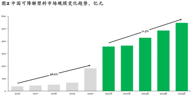受此影響,作為傳統(tǒng)塑料替代產(chǎn)品的可降解塑料市場大幅度增長,訂單暴增,我們預(yù)計(jì)“十四五”期間,可降解塑料市場將以11.3%的年復(fù)合增速,到2025年實(shí)現(xiàn)500億元以上的收入規(guī)模(見圖2)。