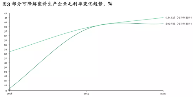 與此同時(shí),可降解塑料產(chǎn)品價(jià)格近一年來攀升,例如禁塑令前PLA價(jià)格為2萬元/噸,現(xiàn)在一些地方的市場價(jià)已高達(dá)5萬元/噸。這直接提升了行業(yè)整體盈利水平,例如金發(fā)科技、億帆醫(yī)藥等企業(yè)2019、2020年的毛利率均接近40%,相比2018年大幅提升(見圖3)。