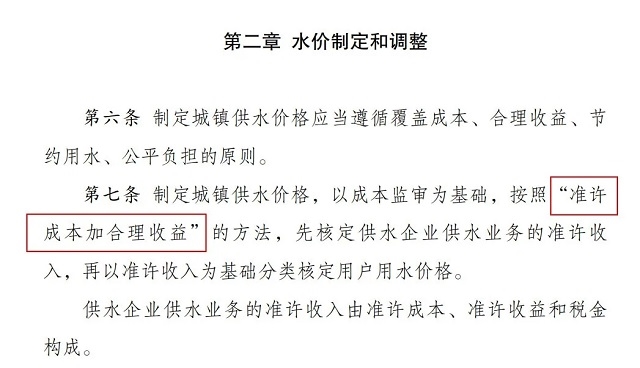 例如,《管理辦法》第二章明確了供水價格的定價原則,要求按照“準(zhǔn)許成本加合理收益”的方法核定城鎮(zhèn)供水價格。