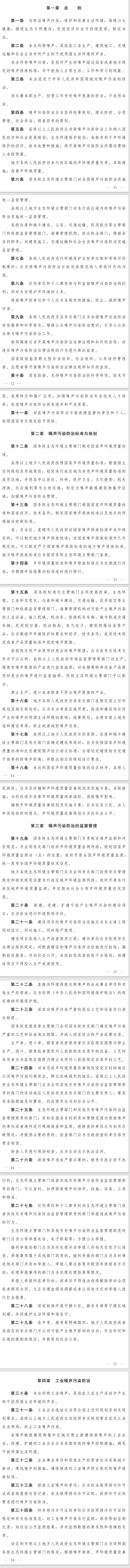 第十五條 國(guó)務(wù)院標(biāo)準(zhǔn)化主管部門(mén)會(huì)同發(fā)展改革、生態(tài)環(huán)境、工業(yè)和信息化、住房和城鄉(xiāng)建設(shè)、交通運(yùn)輸、民用航空等主管部門(mén)和鐵路監(jiān)督管理部門(mén)、海事管理機(jī)構(gòu)對(duì)可能產(chǎn)生噪聲污染的工業(yè)設(shè)備、施工機(jī)械、機(jī)動(dòng)車、鐵路機(jī)車車輛、城市軌道交通車輛、民用航空器、機(jī)動(dòng)船舶、電氣電子、建筑附屬設(shè)備等產(chǎn)品,應(yīng)當(dāng)根據(jù)聲環(huán)境保護(hù)的要求和經(jīng)濟(jì)、技術(shù)條件,在其技術(shù)規(guī)范或者產(chǎn)品質(zhì)量標(biāo)準(zhǔn)中規(guī)定噪聲限值。