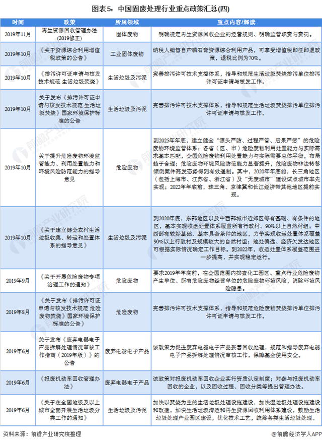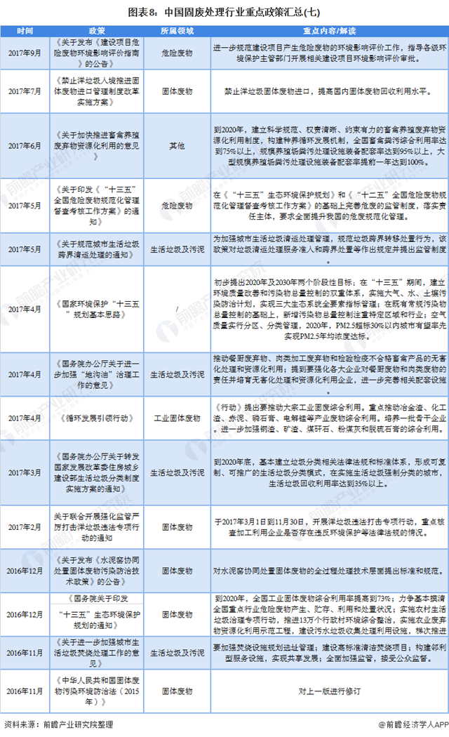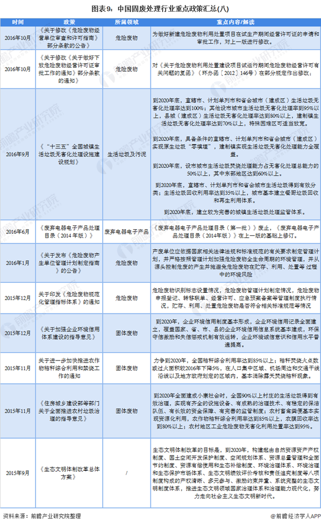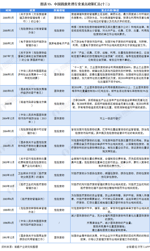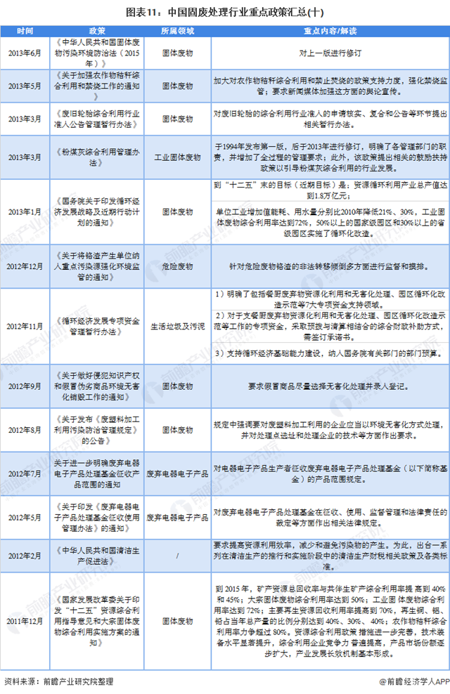 我國固廢行業(yè)相關(guān)的重點(diǎn)政策針對方面主要可分為綜合固體廢物、危險廢物、工業(yè)固體廢物、廢棄電器電子產(chǎn)品、生活垃圾及污泥及其他,在該基礎(chǔ)上,針對不同方面出臺了數(shù)量相當(dāng)?shù)恼咭砸?guī)定和支持固廢處理及其相關(guān)產(chǎn)業(yè)(例如,垃圾焚燒發(fā)電等)的產(chǎn)業(yè)化發(fā)展。