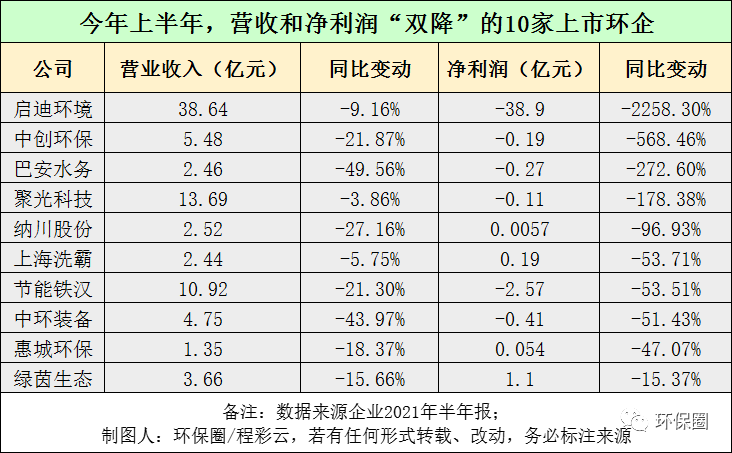 也就是說,今年上半年,111家上市環(huán)企中,無論是營(yíng)業(yè)收入,還是歸母凈利潤(rùn)方面,大家都表現(xiàn)得不錯(cuò),一掃2020年的悲觀情緒,70%以上的環(huán)保企業(yè)都向股東和市場(chǎng)交付了一張靚麗的答卷,實(shí)現(xiàn)了“后疫情時(shí)代”的強(qiáng)勢(shì)反彈。具體到個(gè)股,絕大多數(shù)企業(yè)也都在今年上半年開了個(gè)好頭,經(jīng)營(yíng)業(yè)績(jī)打了個(gè)漂亮“翻身仗”。有的一改往日業(yè)績(jī)頹勢(shì),歸母凈利潤(rùn)實(shí)現(xiàn)百分之幾千增長(zhǎng),如雪浪環(huán)境,城發(fā)環(huán)境、雪迪龍;也有的逐步擺脫虧損帽子,歸母凈利潤(rùn)實(shí)現(xiàn)百分之幾百的大增,如中金環(huán)境、嶺南股份、蒙草生態(tài)、津膜科技、菲達(dá)環(huán)保等;還有的細(xì)分領(lǐng)域龍頭,如上文提到格林美、碧水源、清新環(huán)境,也從去年疫情和產(chǎn)業(yè)寒冬的陣痛中慢慢地企穩(wěn)、好轉(zhuǎn),重現(xiàn)往日輝煌。歷經(jīng)了金融領(lǐng)域去杠桿、PPP政策強(qiáng)監(jiān)管、新冠肺炎疫情沖擊以及民企易主“混改潮”后,這些上市環(huán)企雖然有過迷茫,有過失敗,有過反思,但最終還是重拾信心,不屈不撓,終于迎來了業(yè)績(jī)復(fù)蘇。不過,今年上半年,在業(yè)績(jī)普遍好轉(zhuǎn)的背景下,依然還是有個(gè)別環(huán)保企業(yè)“不爭(zhēng)氣”,表現(xiàn)差強(qiáng)人意,比如啟迪環(huán)境、巴安水務(wù)、節(jié)能國禎、聚光科技、中環(huán)裝備等10家企業(yè)(如圖三所示),營(yíng)收和凈利潤(rùn)雙雙下滑,甚至有的企業(yè)較上年同期,虧損幅度擴(kuò)大化,前景堪憂。圖三:今年上半年,營(yíng)收和凈利潤(rùn)“雙降”的10家上市環(huán)企▼