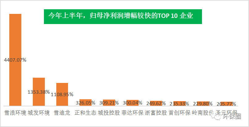 營(yíng)收變動(dòng)幅度方面,數(shù)據(jù)同樣喜人。111家上市環(huán)企,除了那些穩(wěn)步連續(xù)增長(zhǎng)“卓越者”,每年總有一些讓人意想不到的“黑馬”企業(yè)率先突圍出來,少則百分之幾百增長(zhǎng),多則百分之上千增長(zhǎng),成為上半年?duì)I收增速最快的10家先鋒企業(yè)。在半年度營(yíng)收增速TOP10中,既有坐落于上海的房產(chǎn)/水務(wù)/固廢“三劍齊發(fā)”的城投控股以及旗下的上海環(huán)境,也有因納入電價(jià)補(bǔ)貼、部分焚燒項(xiàng)目轉(zhuǎn)運(yùn)營(yíng)推動(dòng)業(yè)績(jī)大增的城發(fā)環(huán)境和圣元環(huán)保,亦有去年業(yè)績(jī)還萎靡不振的萬邦達(dá)和東方園林(如圖六所示)。圖六:半年度營(yíng)收增速較快的TOP10榜單▼