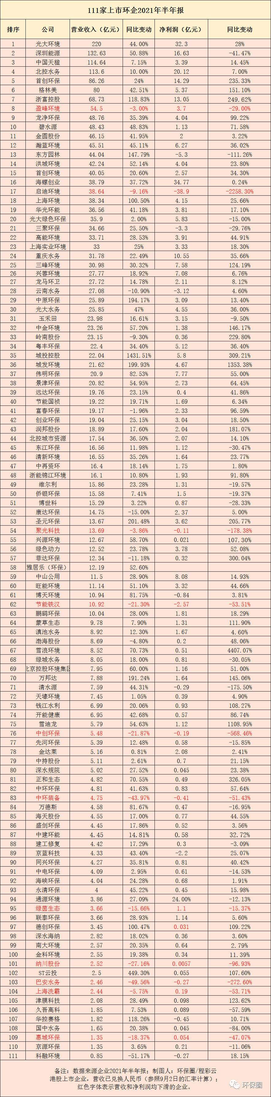 如往常一樣,每年筆者都會(huì)花費(fèi)2周左右時(shí)間統(tǒng)計(jì)制圖,通過營(yíng)收、營(yíng)收增幅、凈利潤(rùn)、凈利潤(rùn)增幅等幾方面的數(shù)據(jù)維度,為讀者展現(xiàn)每家上市環(huán)企的業(yè)績(jī)?cè)鲩L(zhǎng)情況,以及頭部企業(yè)的變化,從中窺探整體產(chǎn)業(yè)的發(fā)展?fàn)顩r。還記得去年,在統(tǒng)計(jì)百余家上市環(huán)企2020年業(yè)績(jī)時(shí),曾經(jīng)反復(fù)提到到一句話——“疫情影響疊加產(chǎn)業(yè)寒冬余溫,大家普遍過得都不如從前了,別說10%、20%、30%增長(zhǎng),能活下來都不錯(cuò)了?!?/strong>這種“王小二過年,一年不如一年”的形勢(shì),曾經(jīng)導(dǎo)致百余家上市環(huán)企近半數(shù)表現(xiàn)不理想,要么營(yíng)業(yè)收入負(fù)增長(zhǎng),要么歸母凈利潤(rùn)下滑或虧損,其中不乏有排名非常靠前的細(xì)分領(lǐng)域龍頭,如北控水務(wù)、格林美、碧水源、啟迪環(huán)境、東江環(huán)保等,好的不好,差的更差。那么今年上半年呢?環(huán)保企業(yè)是繼續(xù)一蹶不振,業(yè)績(jī)持續(xù)低迷?還是東山再起,打了漂亮翻身仗?總體來看,今年上半年,111家上市環(huán)保企業(yè)中,營(yíng)收同比增長(zhǎng)的高達(dá)97家,占比87%;歸母凈利潤(rùn)同比增加則有83家,約占75%;營(yíng)收和歸母凈利潤(rùn)“雙增”有75家,約占總數(shù)67%(如圖一圖二所示)。圖一:111家上市環(huán)保企業(yè)2021中報(bào)總體情況▼