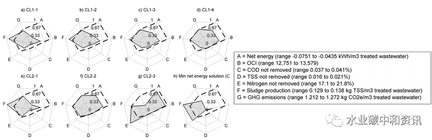 各類方案中可持續(xù)指標(biāo)評(píng)價(jià)一項(xiàng)以可持續(xù)碳中和運(yùn)行為目標(biāo)的積極分析表明,淹沒(méi)式厭氧膜生物反應(yīng)器(AnMBR)可能是凈能量明顯的,有利于形成碳負(fù)污水管理(Pretel et al.)。在該分析中,利用定量可持續(xù)設(shè)計(jì)過(guò)程,使用技術(shù)、環(huán)境和經(jīng)濟(jì)標(biāo)準(zhǔn)評(píng)估了全部可行的設(shè)計(jì)方案,來(lái)完善AnMBR詳細(xì)設(shè)計(jì)。其中,集成了跨季節(jié)溫度穩(wěn)態(tài)性能建模(使用中試實(shí)驗(yàn)數(shù)據(jù)和模擬軟 DESASS)、生命周期成本分析(LCC)和生命周期評(píng)價(jià)(LCA)。