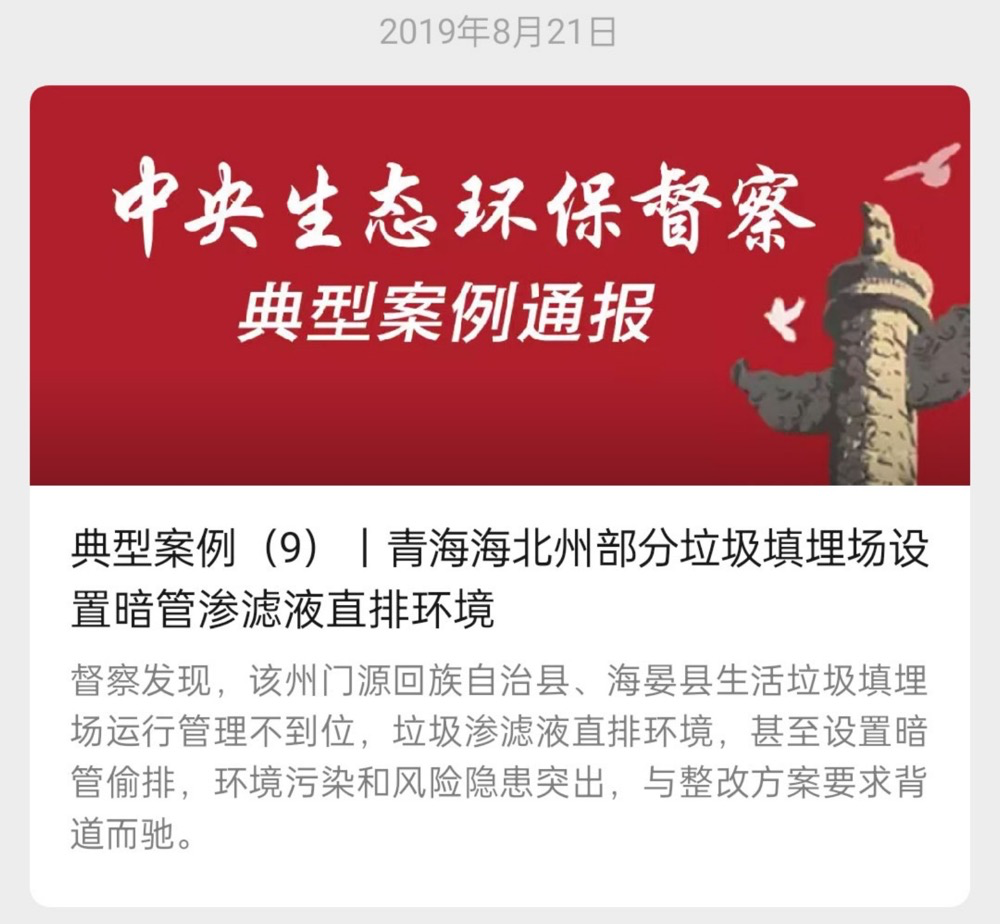 1、典型案例(9)丨青海海北州部分垃圾填埋場(chǎng)設(shè)置暗管滲濾液直排環(huán)境,生態(tài)環(huán)境部,2019-08-21